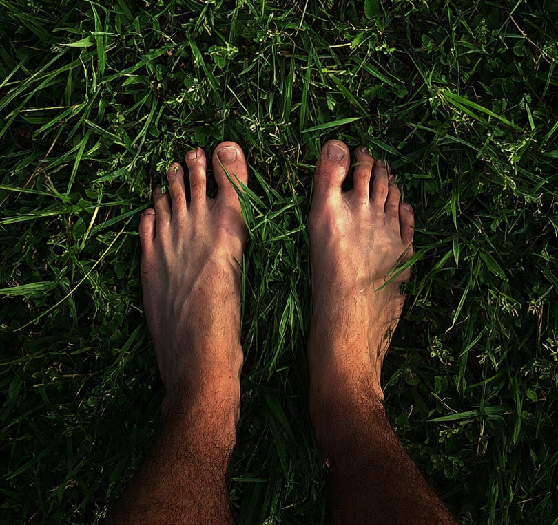 Walking barefoot on natural surfaces like grass, dirt, or sand